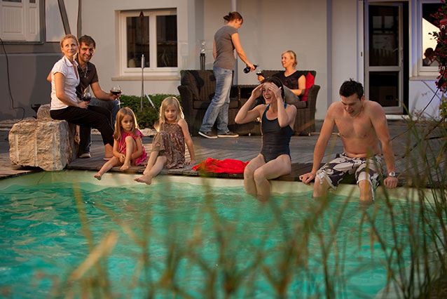 Ohne Chlor oder andere chemische Zusätze wird hier das Wasser in einer bepflanzten Filterzone gereinigt. So ist natürlich und kristallklarer Badespaß garantiert.